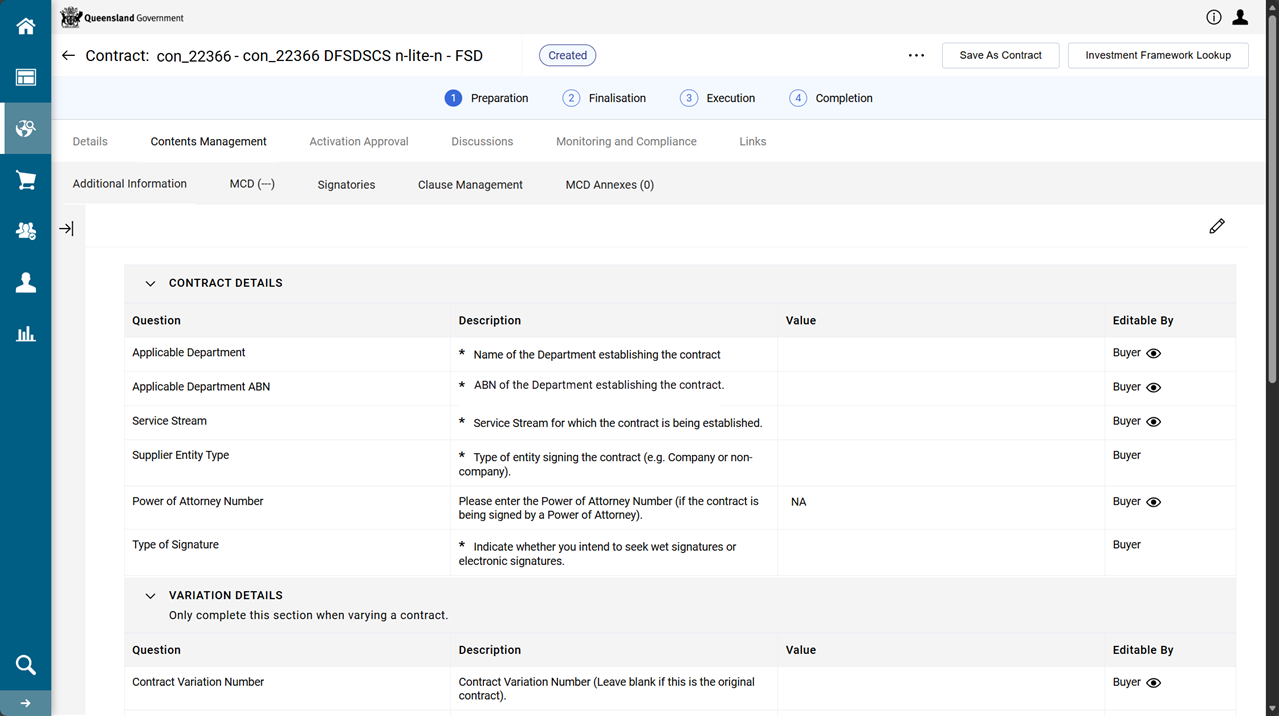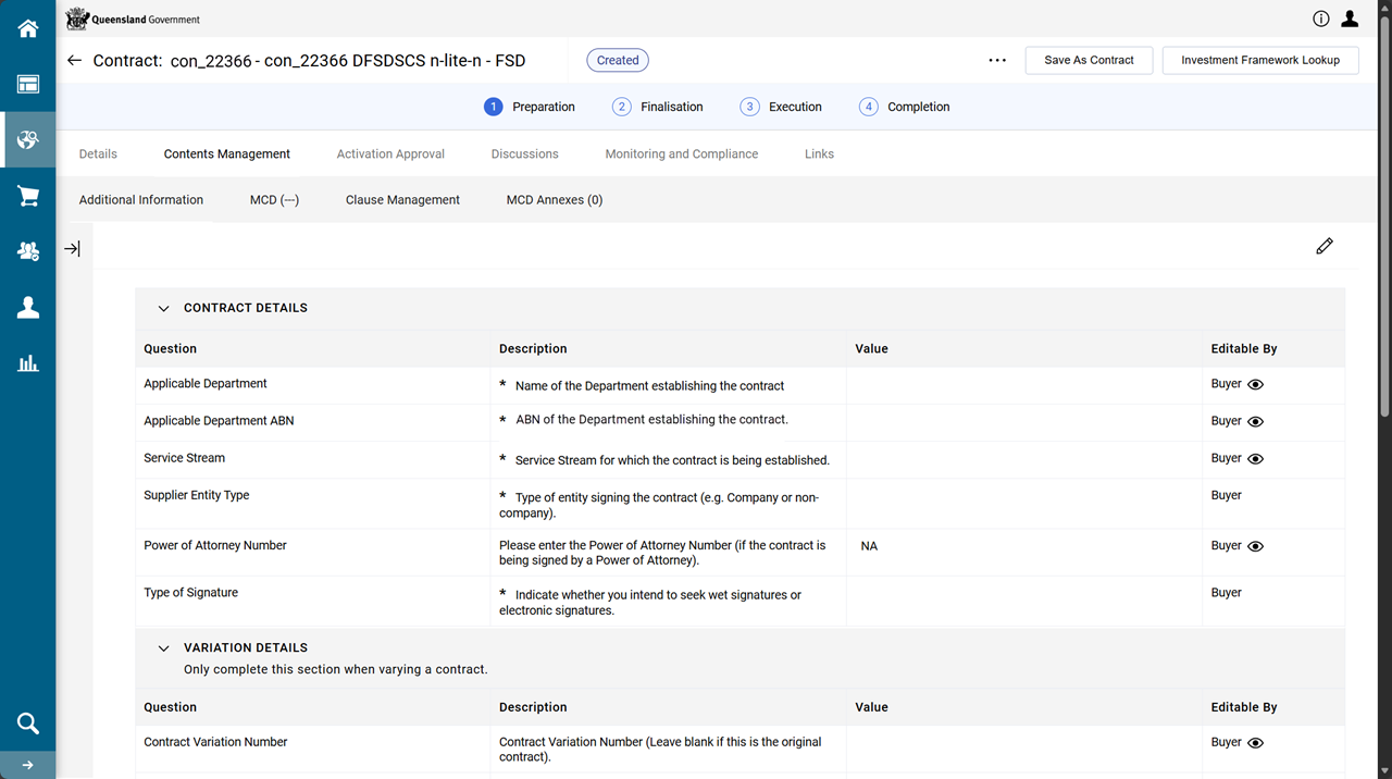 Consider carefully setting these fields as the settings are fixed for the life of the contract, including the contract variation process. For example, if contract negotiation is set to occur during initial contract creation, it will occur during the contract variation process.