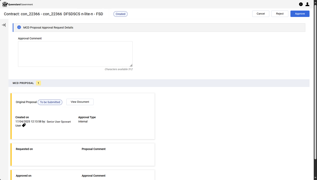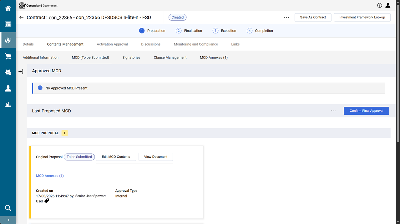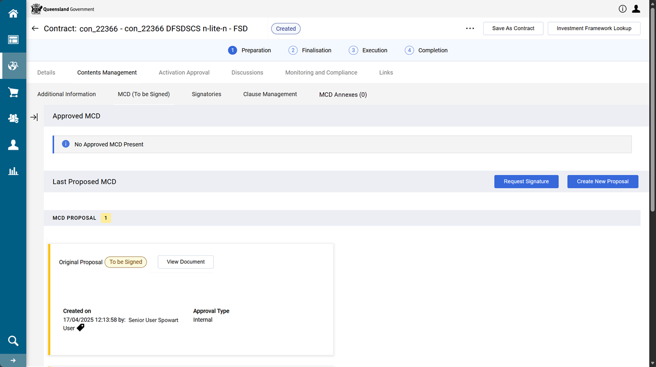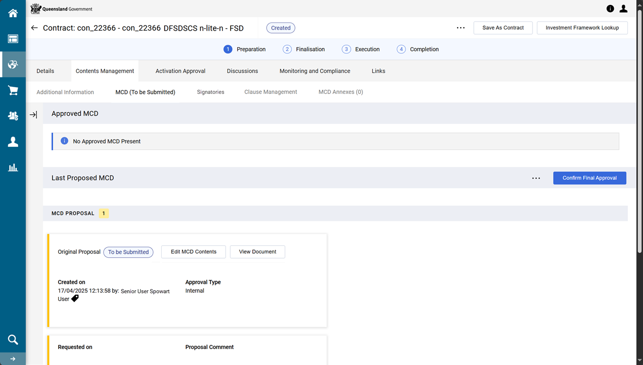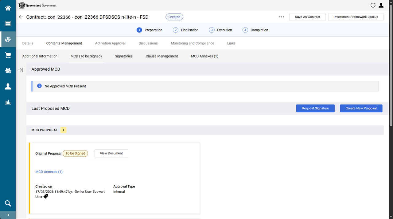 Note The Warning for MCD - Conditions not met for Contract Activation highlights the Last MCD Proposal Not Approved. This is expected and is normal for this point in the process. Correct any other warnings.