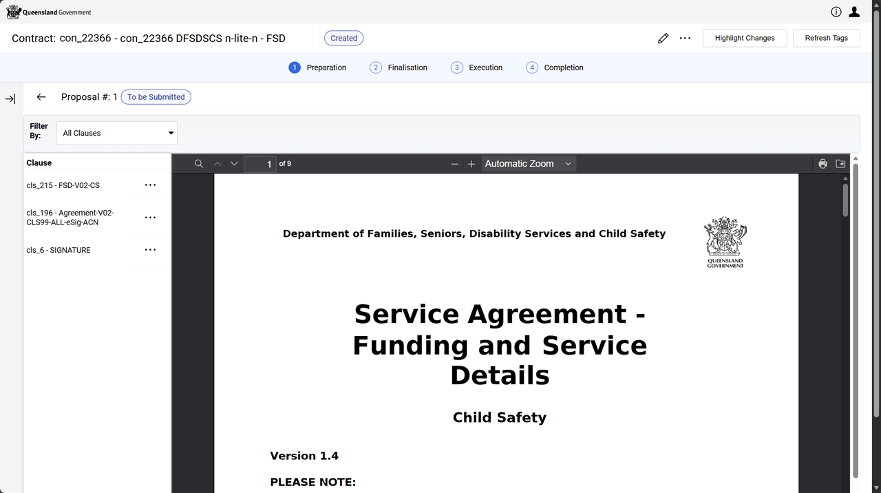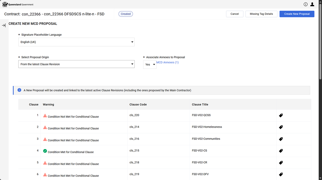 Note There is a Signatories page (between the MCD and Clause Management pages).